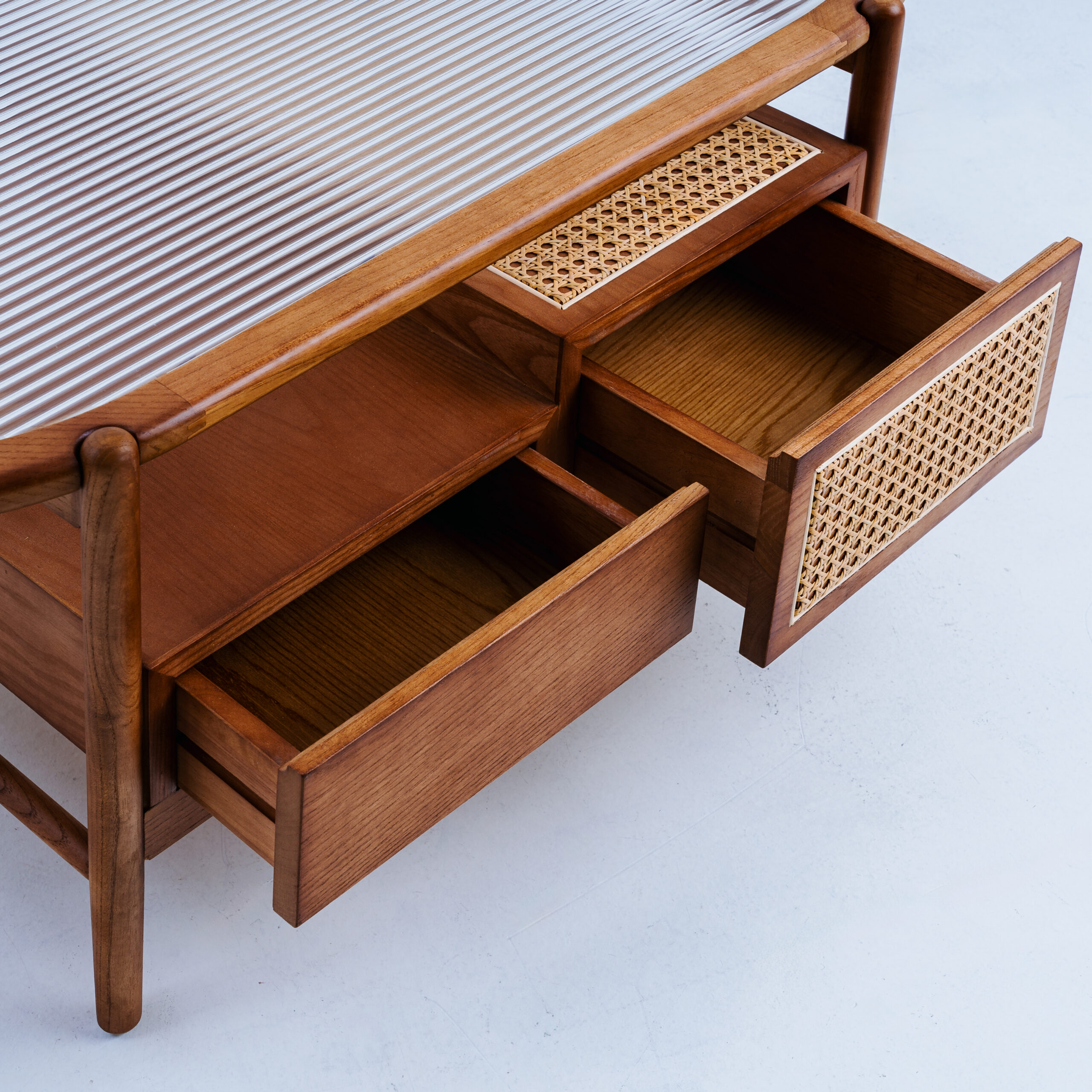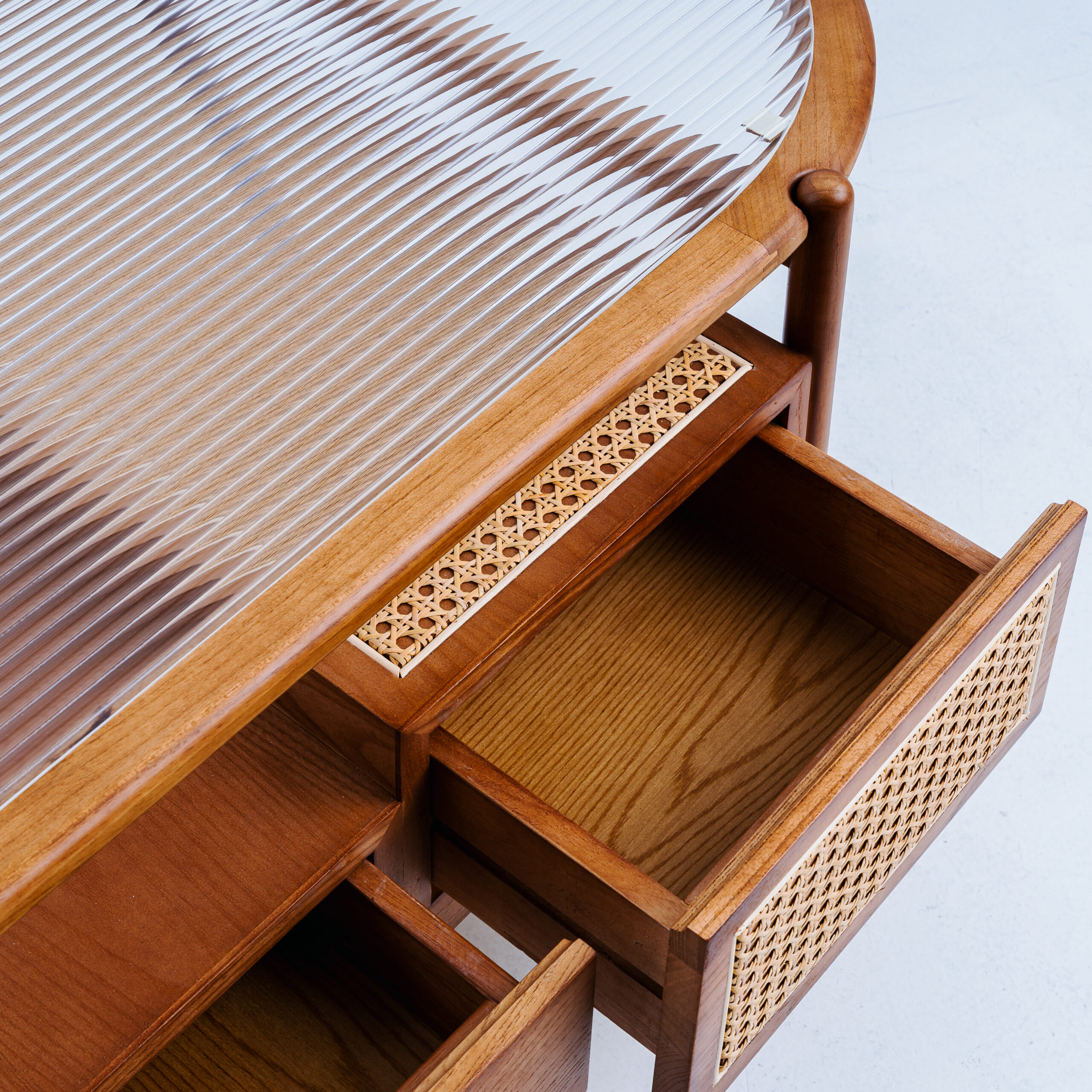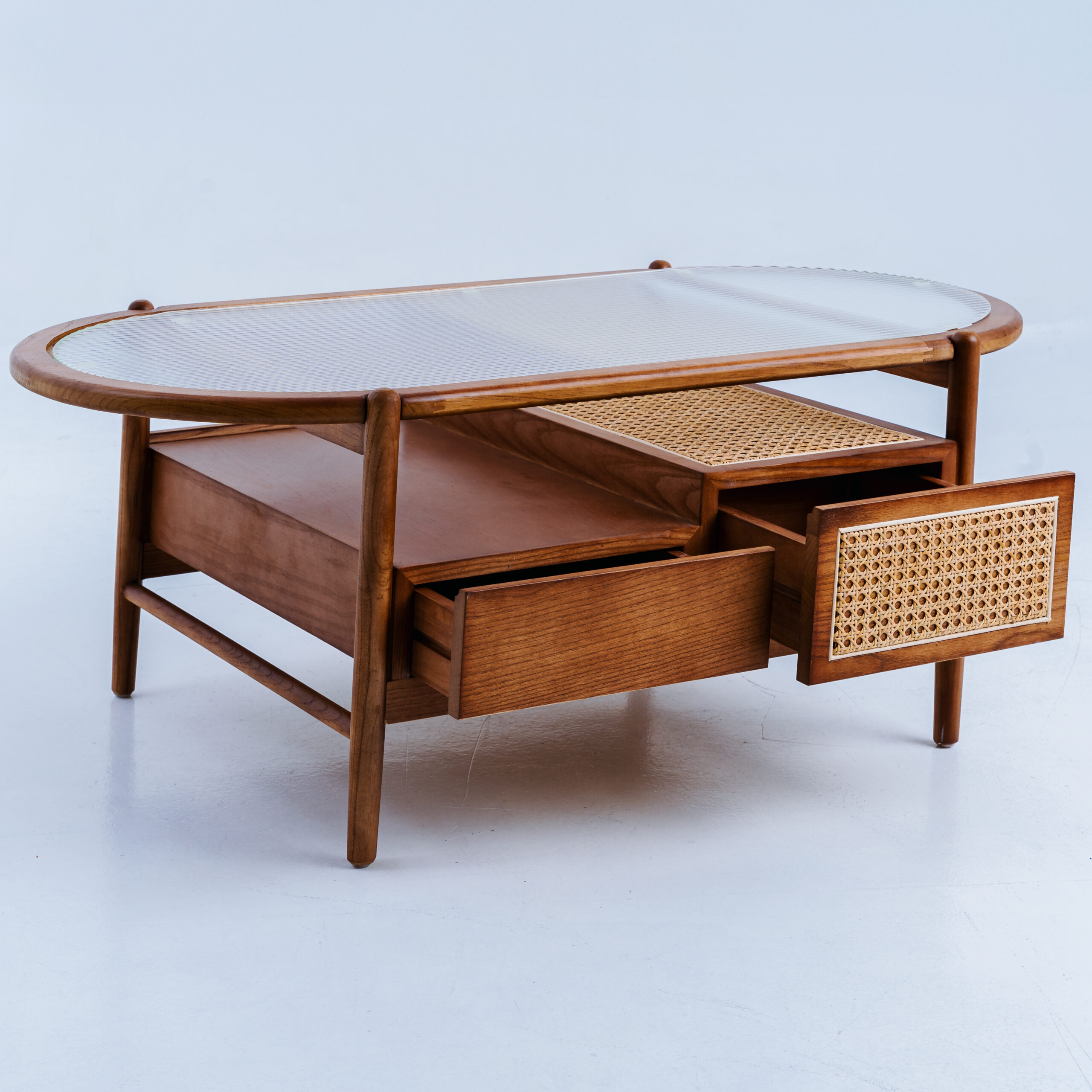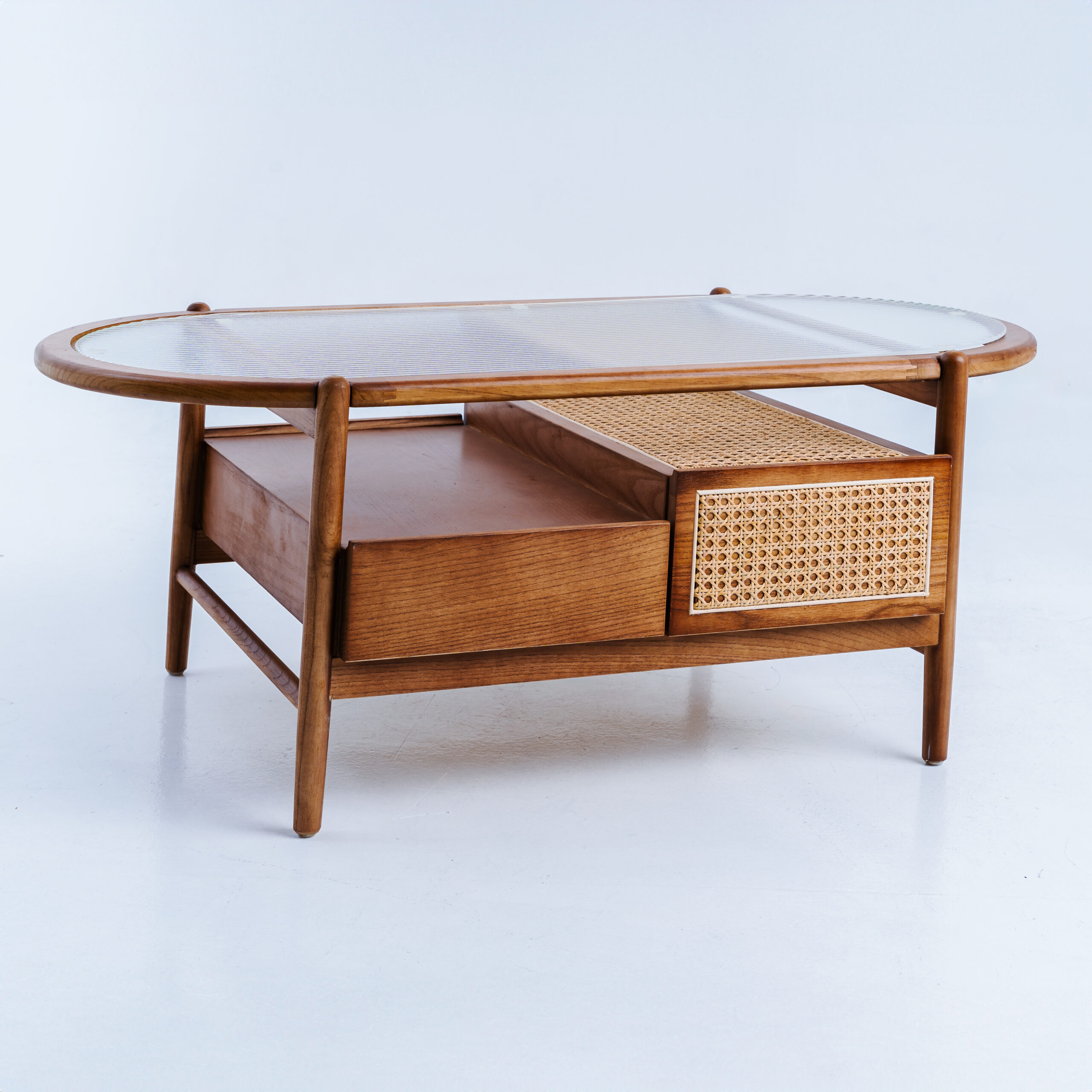 This piece brings natural beauty and function together with its boho-inspired design. The oval-shaped top is made of sturdy tempered glass, allowing for easy cleaning and a sleek look, while the lower shelf, crafted from rattan, provides extra storage for books, magazines, or decorative accents. The warm wood frame and smooth lines make this piece versatile enough to fit into any living room.