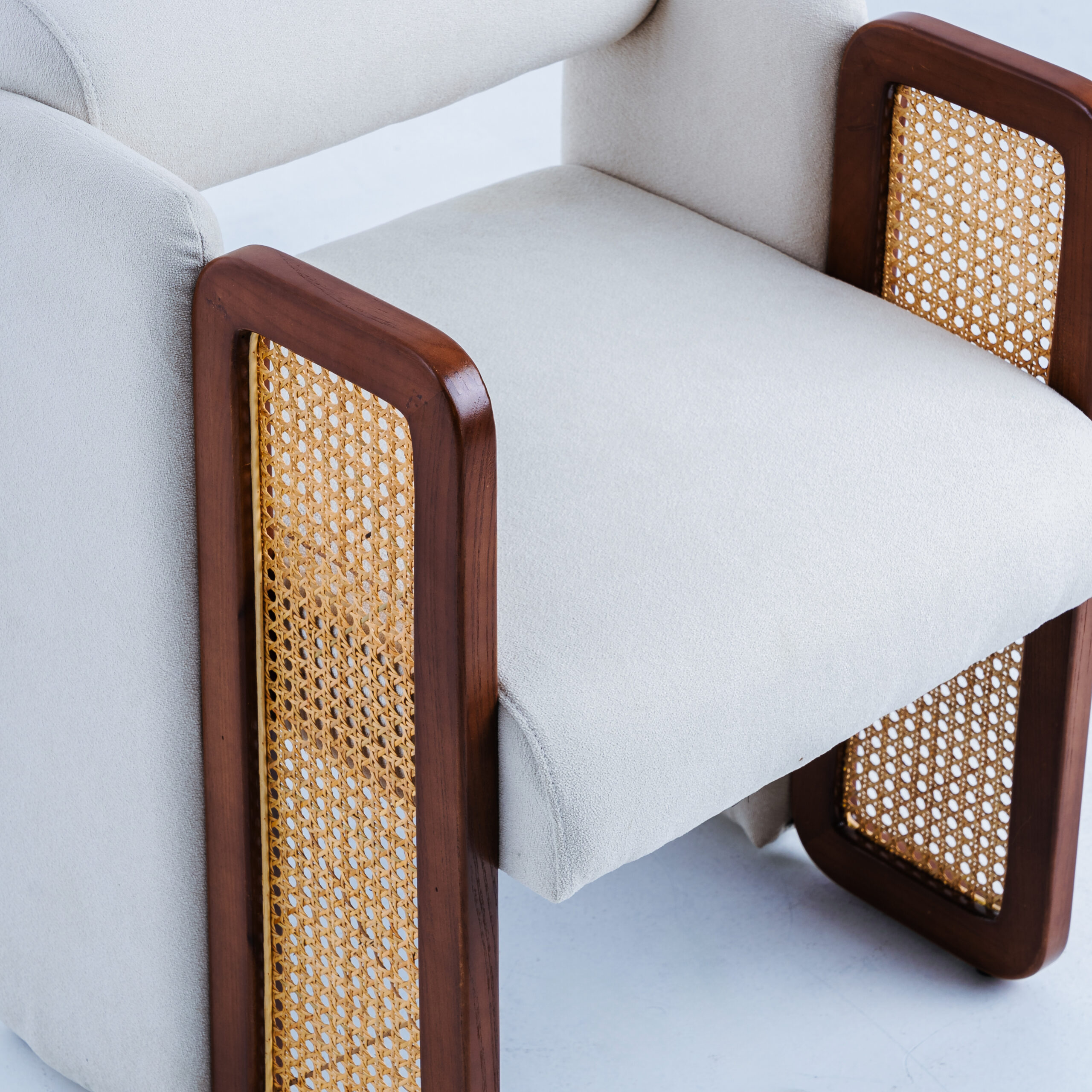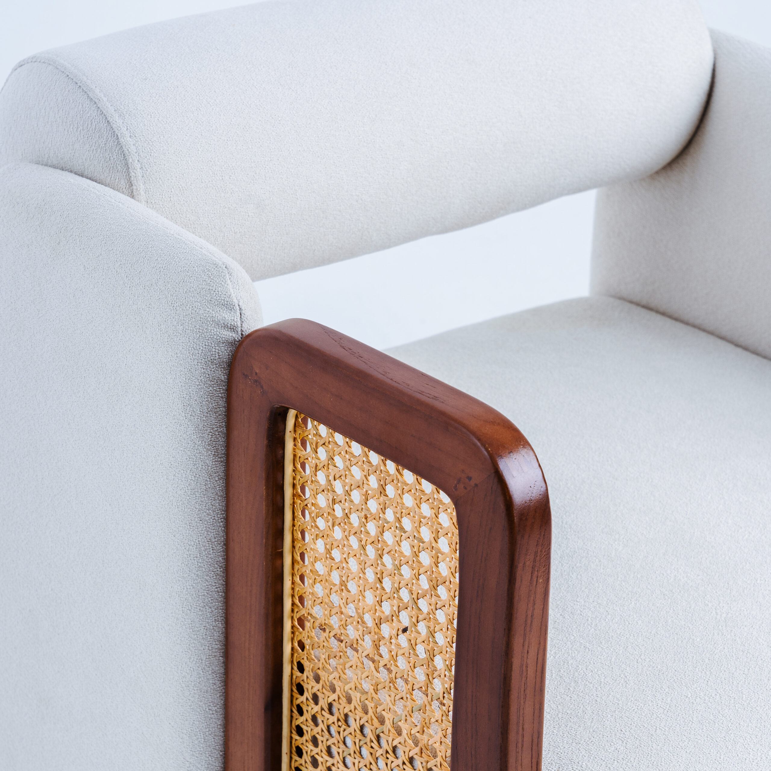 This chair offers the perfect balance between comfort and sophistication. Its cushioned upholstery features soft, cream-colored fabric that contrasts beautifully with the rich wood and handwoven rattan armrests. The chair’s design is both classic and contemporary, making it ideal for anyone looking to enhance their space. Perfect for lounging or as an accent piece, this chair offers exceptional support while elevating itself along with your interior’s aesthetic.