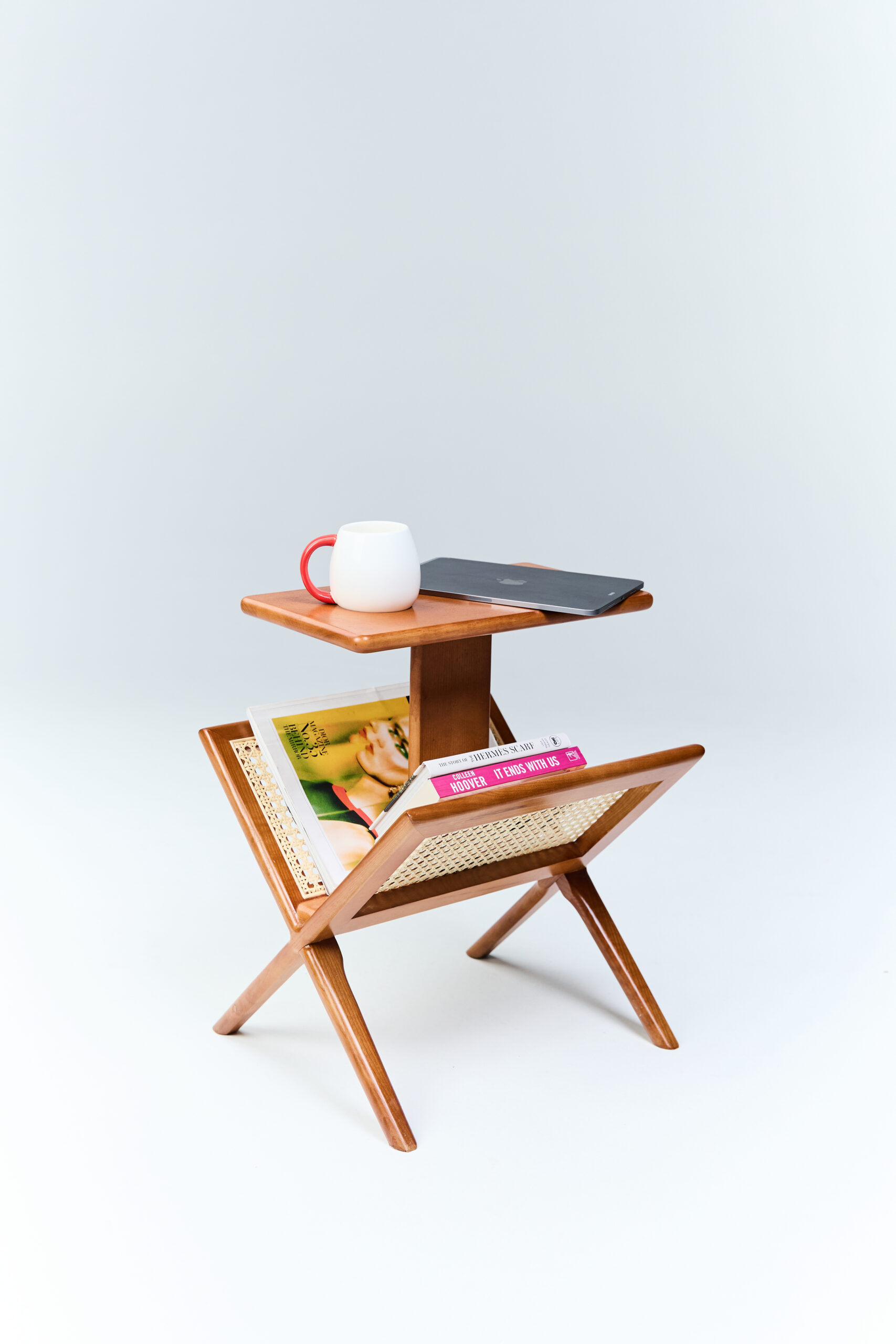 At its heart is a spacious magazine rack, perfect for organizing your reading materials or storing essentials within easy reach. Ideal for holding books, tablets, or decorative items, ensuring everything stays neatly organized.At the top is the tabletop, which doubles as a small desk complete with a convenient cup holder.
